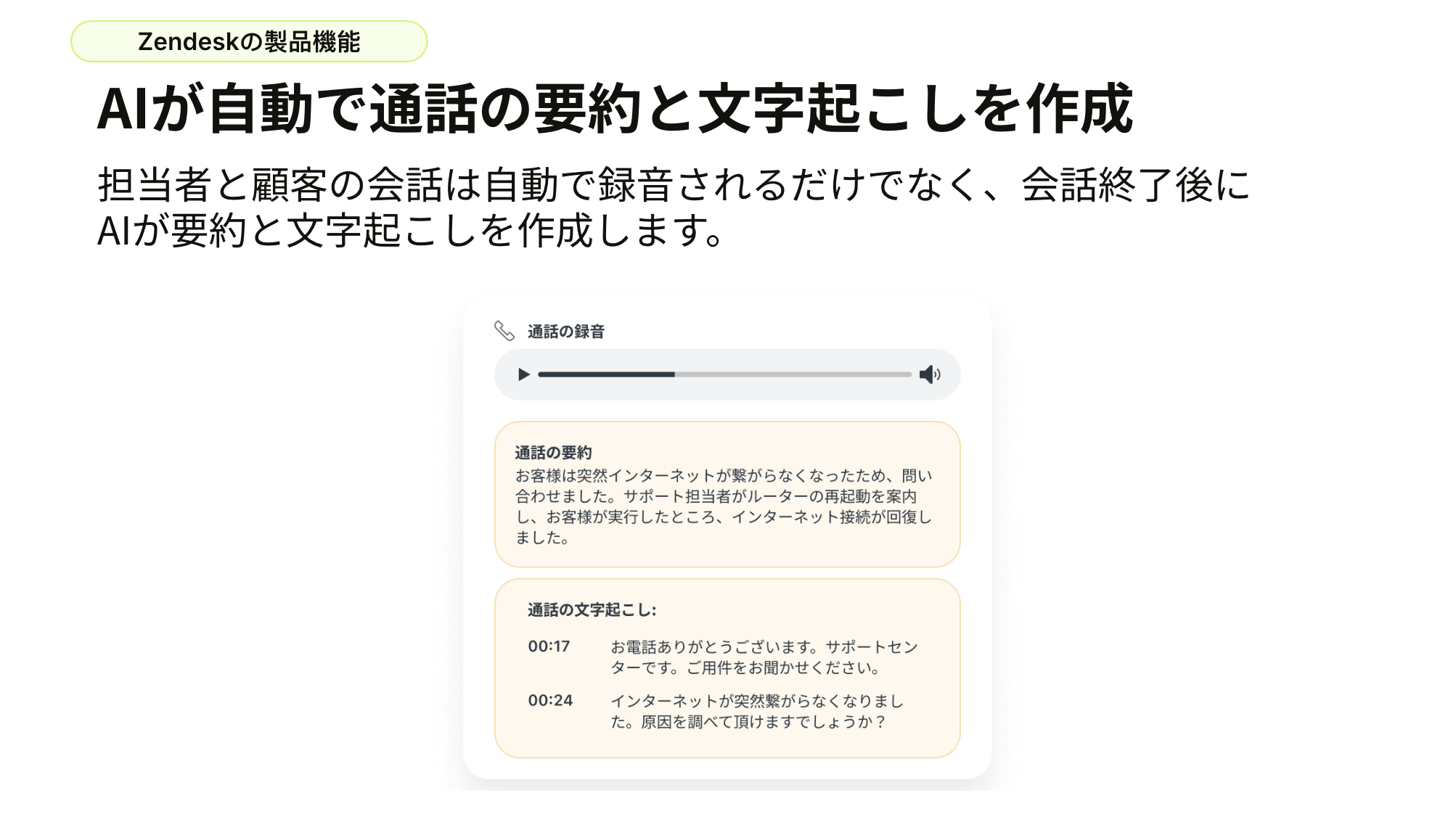 Zendeskに搭載されている音声機能により、通話を自動で録音し、その内容をAIが文字起こし・要約します。これにより、従来は時間がかかっていた応対後の記録作成にかかる時間を大幅に削減可能です。また、従来は応対中に記録のために手入力で詳細なメモをオペレーターが書いていましたが、AIが代わりに応対内容を記録するため、要点の確認と微調整だけに集中でき、結果としてACWの短縮につながります。