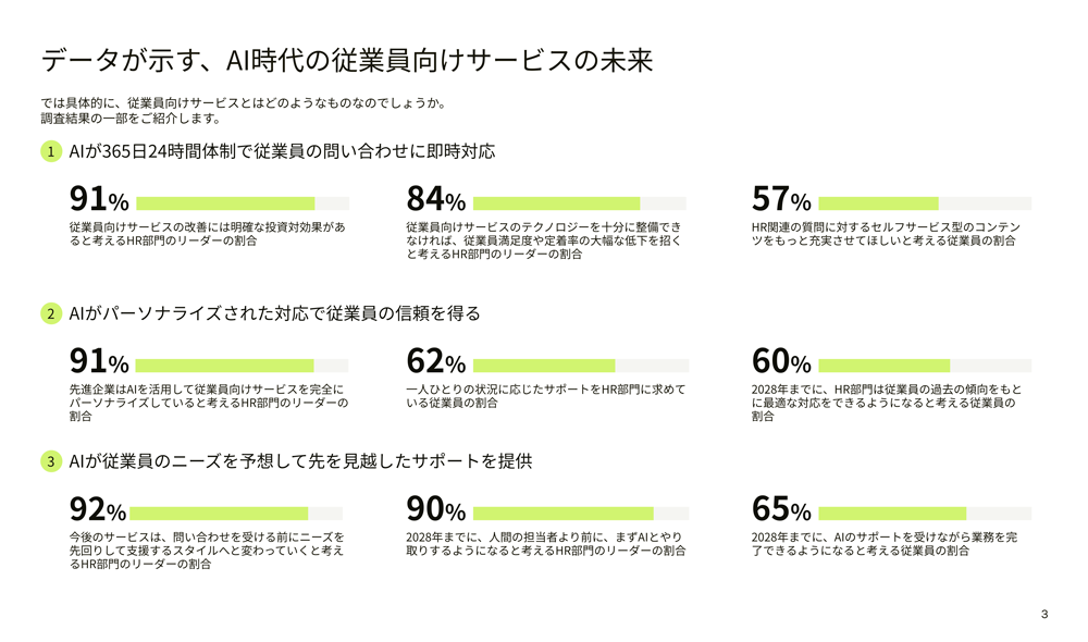 人事部門が直面する急速な変化に対応し、従業員体験を向上させるために、AIの活用が注目されています。本資料では、Zendeskが世界1,400名以上のHRリーダーと従業員を対象に行った調査結果をもとに、AIが果たすべき3つの役割と今後のHR業務のあり方について、具体的なデータをもとに紹介します。