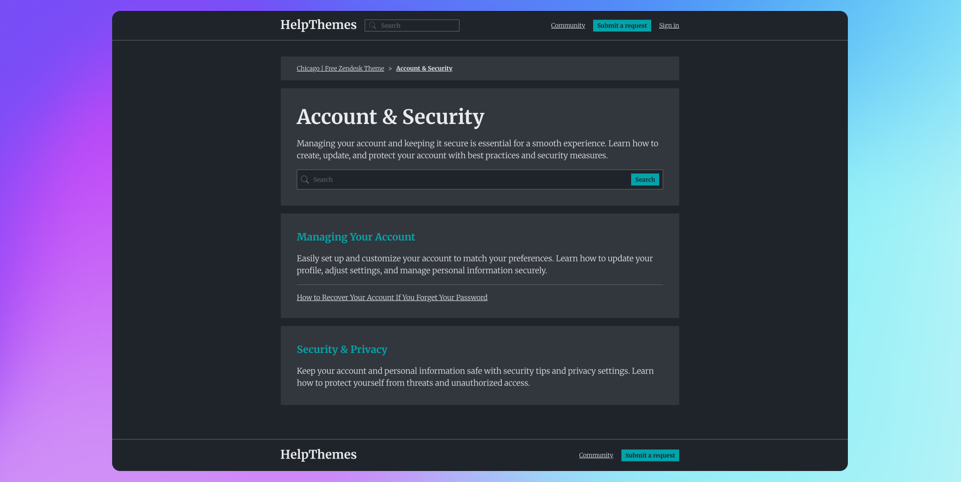 This theme brings a bold dark-mode design with clean lines, sharp contrast, and modern turquoise accents that stand out. It’s built for flexibility — fully responsive, easy to customize, and adaptable to any brand. Whether you’re embracing dark aesthetics or just want a crisp, modern support center, this theme is AI-ready and powered by Zendesk’s Templating API V4.