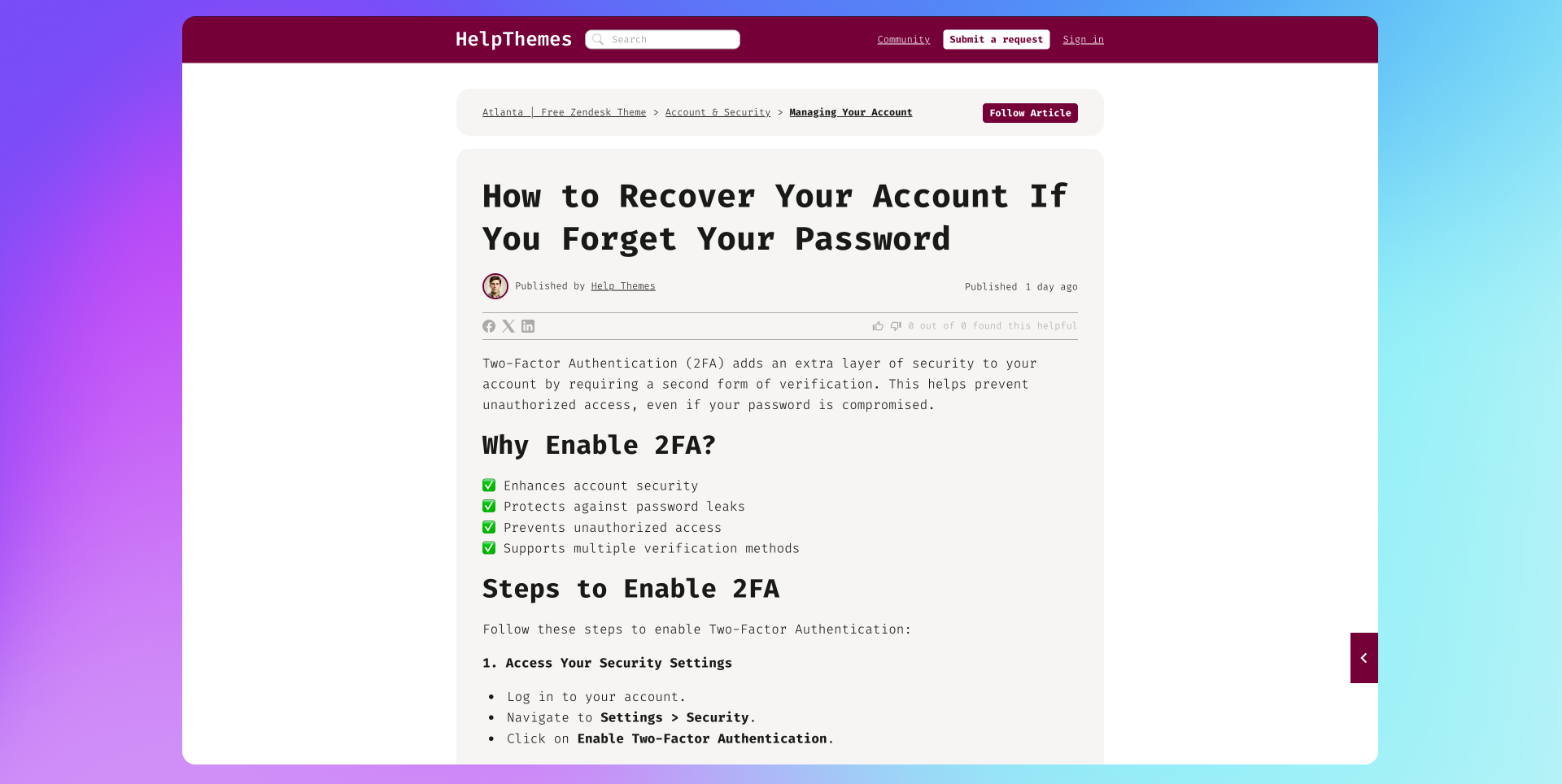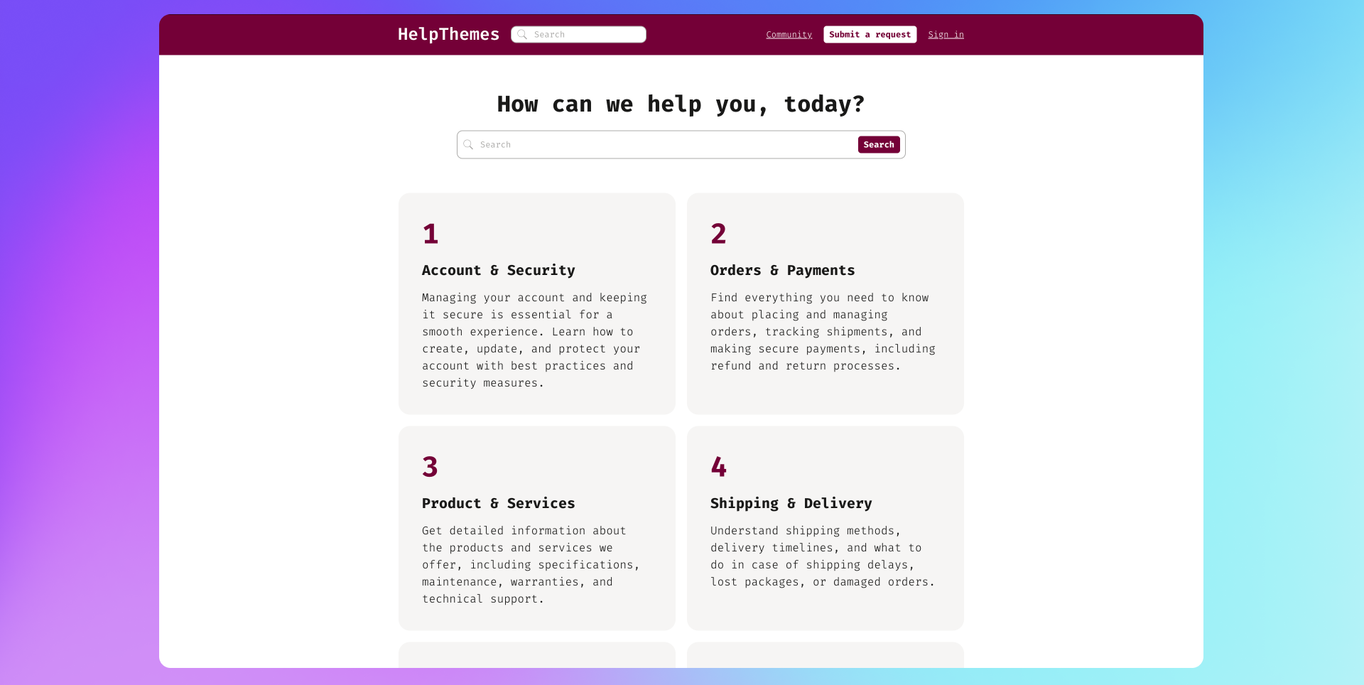 HelpThemes is a design and development agency focused on providing Zendesk customers with the largest collection of easy-to-customize themes. We've developed the largest collection of free Zendesk themes on the internet. Check out more of our free Zendesk themes at HelpThemes.com.