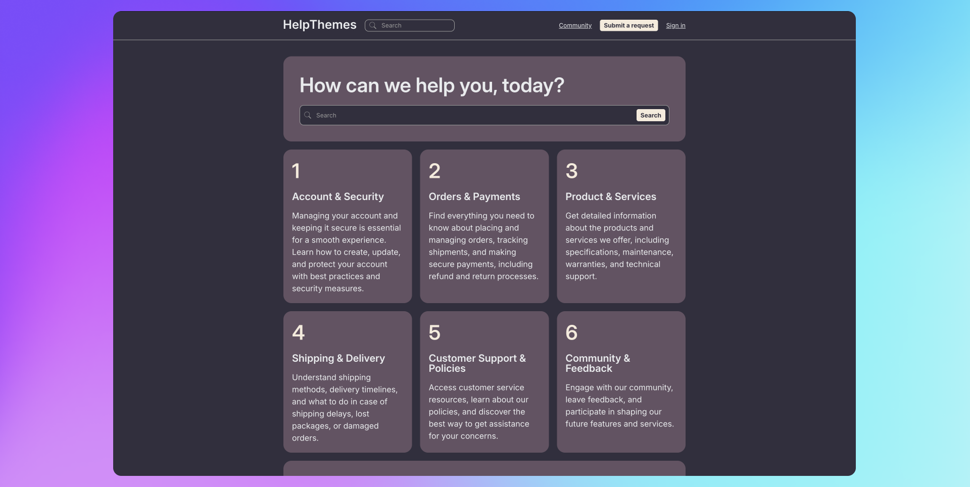 This theme delivers a structured and modern layout using large numbered blocks for intuitive navigation and content scanning — all wrapped in a dark, focused interface. Designed for clarity and simplicity, it’s fully responsive, AI-ready, and easy to adapt to any brand. Built with Zendesk’s Templating API V4.